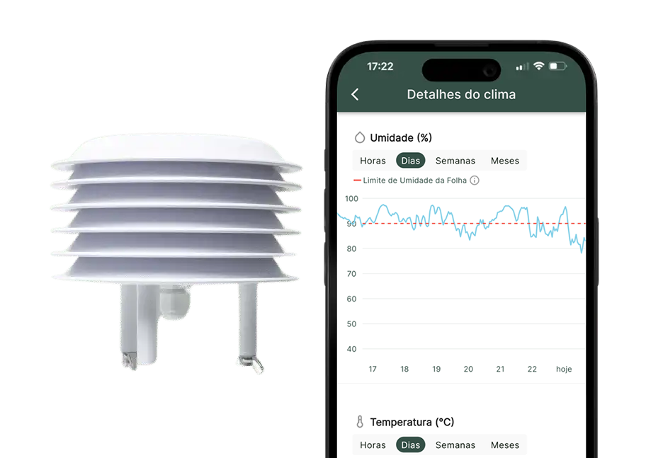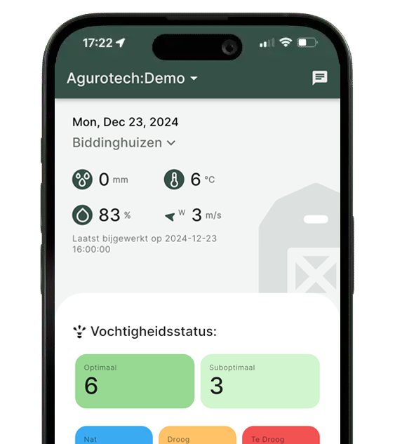 Todos los datos y perspectivas de los sensores de humedad del suelo, estaciones meteorológicas y sensores de cultivo de Agurotech se comparten a través de una misma aplicación Agurotech. Así tendrás todos los datos relevantes cómodamente en un solo lugar. La aplicación Agurotech está disponible para Android, iOS y como aplicación web.