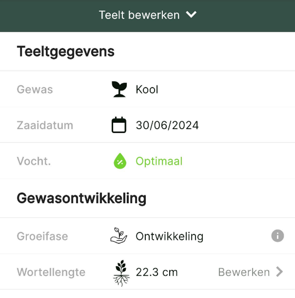 De geschatte wortellengte in Agurotechs applicatie wordt gebruikt om te bepalen op welke dieptes de sensor dient te meten. Op verzoek van onze klanten hebben we de mogelijkheid toegevoegd om de wortellengte in de applicatie aan te passen. Hierdoor kunt u ons direct voorzien van live feedback, zodat we ons advies continu kunnen optimaliseren. Bovendien kunt u, op basis van uw invoer, bepalen welke dieptemetingen van de sensor het beste aansluiten bij de ontwikkeling van uw gewas.