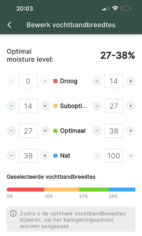Agurotechs beregeningsadvies is afgestemd op uw specifieke bodemsoort en gewas, waarbij Agurotech gebruikmaakt van wetenschappelijk onderbouwde bandbreedtes die gevalideerd zijn in de praktijk. Recentelijk is de mogelijkheid toegevoegd om deze bandbreedtes aan te passen aan uw eigen voorkeuren. Zo kunt u bijvoorbeeld kiezen voor ruimere bandbreedtes als u te maken heeft met beperkte waterbeschikbaarheid of de bandbreedtes verdunnen als u eerder wilt worden geadviseerd. Neem contact met ons op via het Whatsapp kanaal voor eventuele vragen of advies hierover.